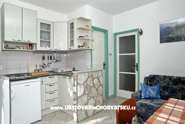 Zeleny apartman Skládá se z obývacího pokoje, jehož součástí je i malá kuchyně - 15 m2, kde je možnost 2 přístýlek Ve druhém pokoji je manželská postel a ještě další postel – dohromady tedy 3-4 lůžka
