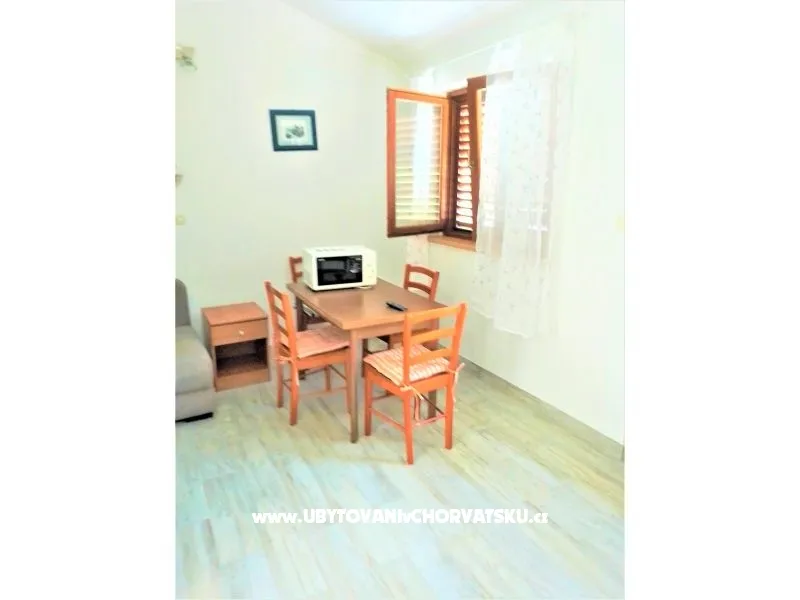 Apartmán (40m2) se skládá z 1 ložnice (manželská postel), obývacího pokoje (rozkládací pohovka pro 2 osoby), koupelny (sprcha/WC), plně vybavené kuchyně, balkonu s výhledem na moře a parkovacím místem ve dvoře, klimatizace, wifi, pračky.