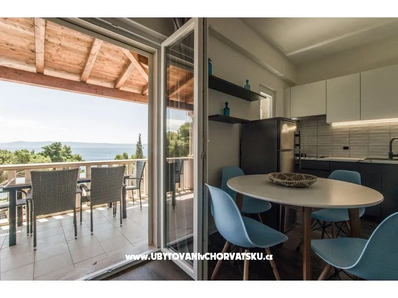 Apartmán 2+2 s 50 m2, ložnice, kuchyně, koupelna a terasa s výhledem na moře.