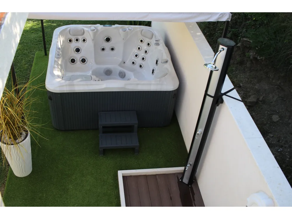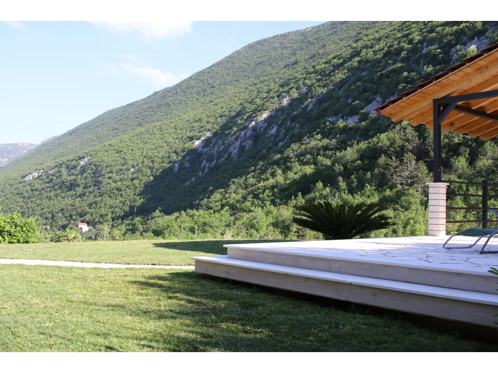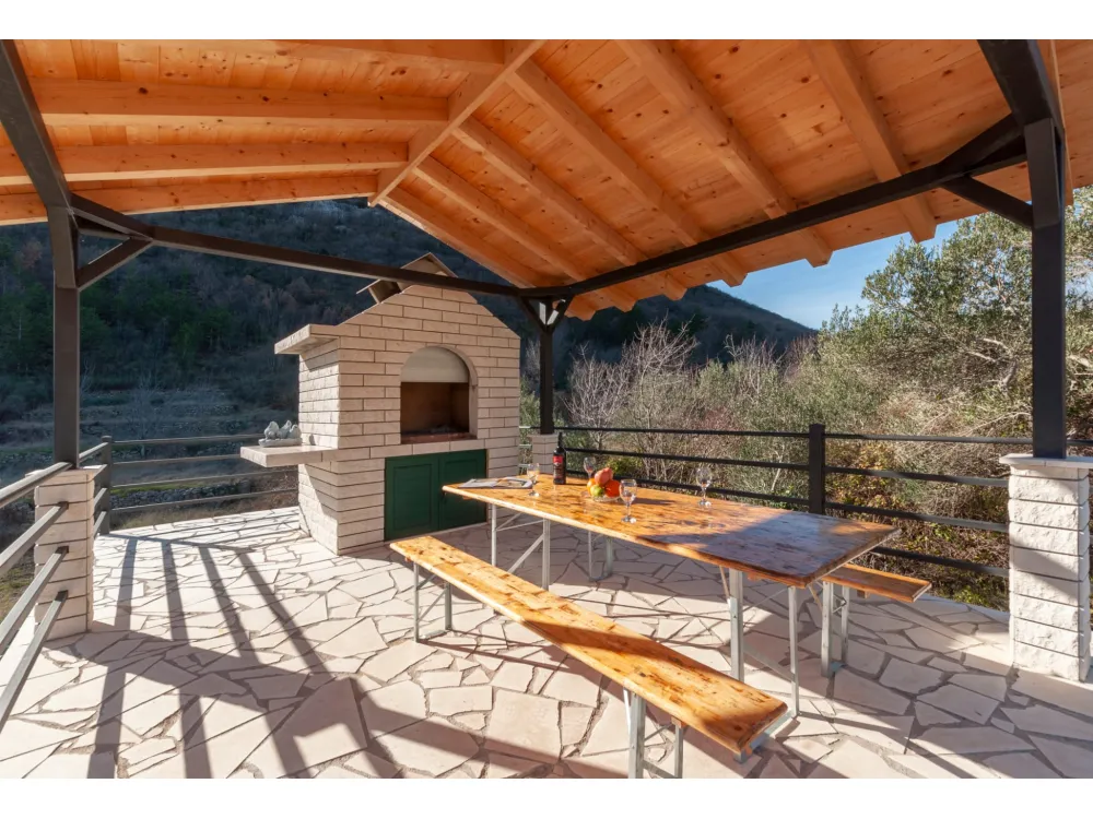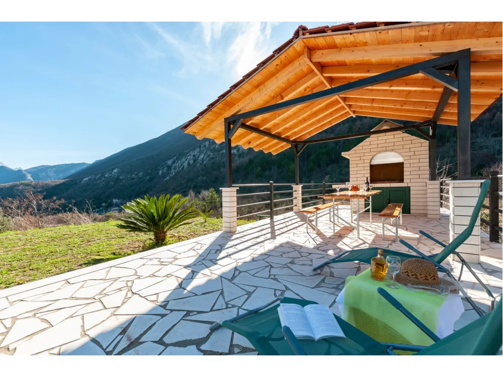 Dům se nachází v krásné přírodě s výhledem na okolní kopce a hory. Má jednu ložnici s manželskou postelí, dále dvě oddělené místnosti s jednolůžky, koupelnu se sprchovým koutem, kuchyň a velký obývací pokoj s rozkládací pohovkou. Velká krytá terasa se sto