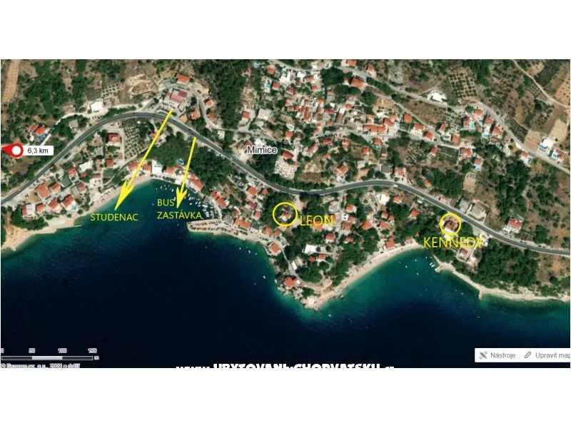 POLOHA: apartmány s nádherným výhledem a výhodnou polohou nad plážemi letoviska Mimice. Dům je na klidném místě pod magistrálou. Centrum letoviska i pláže jsou přístupné po schodišti (130 schodů), které ústí přímo u moře nebo po strmější cestě, která vede do centra Mimice. VYBAVENÍ: klimatizace, terasa s grilem, bezplatný parking nad domem, wi-fi. UBYTOVÁNÍ: Apartmán A6+2 (č. 1) – prostorný byt o rozloze 113 m2 s vlastním vchodem se nachází v podkroví domu a nabízí z terasy nádherný výhled na moře, 3 oddělené ložnice (2x pro 3 osoby a 1x pro 2 osoby), kde každá ložnice má vlastní balkón s výhledem na moře, velký obývací pokoj s terasou a s nádherným výhledem na moře, klimatizace (5,- EUR/den), jídelní stůl, sedací souprava, android TV. Apartmán má 2 koupelny s WC a kompletně vybavenou kuchyňku s velkou chladničkou a mrazákem. Doporučujeme pro velké rodiny nebo přátele, kteří chtějí strávit společnou dovolenou. Apartmán A2+1 (č. 2) – apartmán v 1. patře s klimatizací (5,- EUR/den) a přímým výhledem na moře, ložnice s manželským lůžkem a lůžkem pro 3. osobu, oddělená kuchyňka s chladničkou, koupelna s vanou a WC, balkón s posezením a nádherným výhledem na moře. Studio S2 (č.3 a 5) – studio v 1. patře s manželským lůžkem a klimatizací (5,- EUR/den), koupelna se sprchou, WC, kuchyňský koutek s chladničkou, balkón s čelním výhledem na moře. Studio S2+1 (č. 4) - studio v 1. patře s manželským lůžkem a lůžkem pro 3. osobu, klimatizace (5,- EUR/den), koupelna se sprchou, WC, balkón, kuchyňský koutek s chladničkou je umístěn na boční terase s částečným výhledem na moře. PLÁŽ: k dispozici jsou 2 nádherné oblázkové pláže s pozvolným vstupem do moře. Přímé schodiště od apartmánu ústí u malé oblázkové pláže, další pláže jsou max. do 250m. STRAVOVÁNÍ: vlastní stravování, řada možností se stravovat individuálně v restauracích v okolí. SPORT/ZÁBAVA/NÁKUPY: pošta, obchod s potravinami, pekárna a pizzerie se nachází 300 m od villa Leon. Přímo u obchodu je i autobusová zastávka odkud jezdí linka do Omiše (cca 14 km) nebo na Makarskou riviéru (cca 20 km).