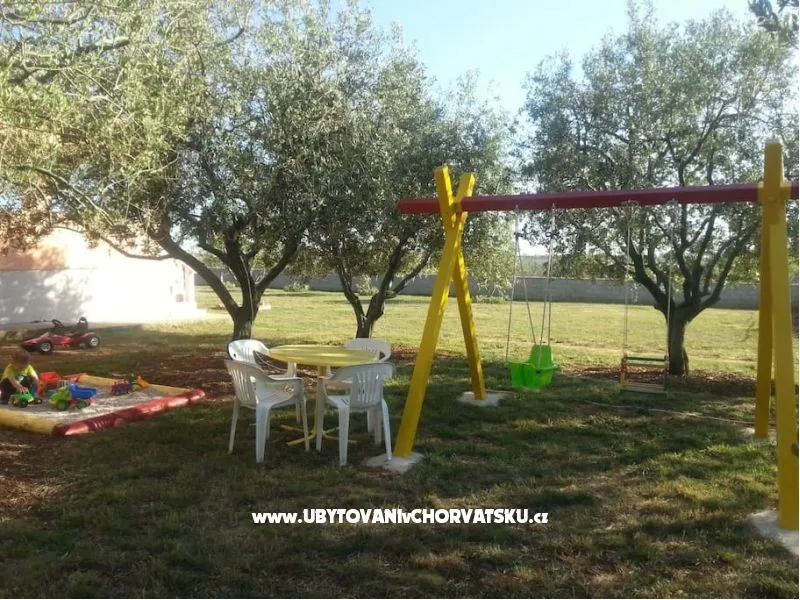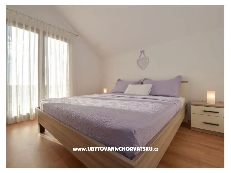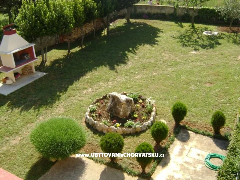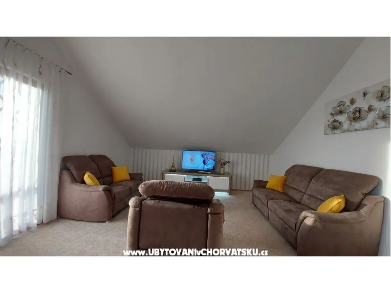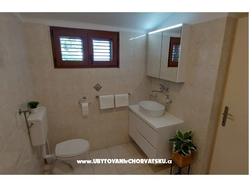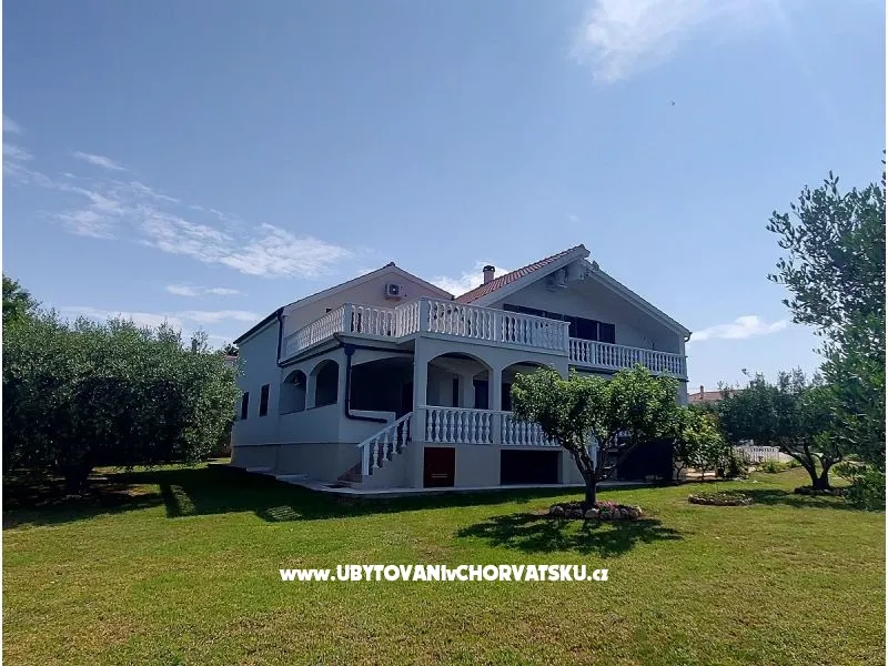 Klimatizovaný apartmán v patře rodinného domu se společným vchodem.WIFI, 3 ložnice, plně zařízená kuchyně s myčkou, obývací, koupelna, navíc wc, 3 terasy z toho 2 s výhledem na moře. Apartmán je obklopen velkým dvorem ideálním pro děti, se zahradou a zahr