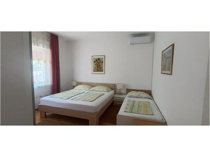 3 ložnice, obývací pokoj, kuchyň, 2 x WC + sprcha, krytá terasa a výhled na moře. Je v patře, se samostatným vchodem. Parkování ve dvoře. Vhodné pro 1/2/3 rodiny. Lehátka na zahradě, bazén pro děti <10 let a gril