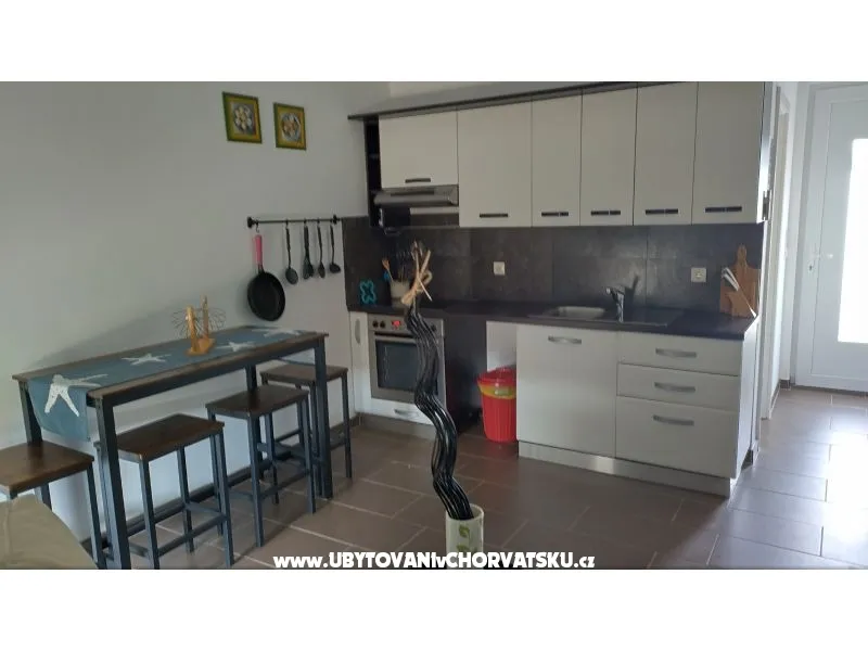 Apartmánový dům byl postaven v roce 2013. Je zateplený, okna mají elektrickou žaluzii a moskytiéru. Voda je ohřívána solárním systémem, který je v případě, že by slunce nesvítilo, doplněn elektrickým ohřevem. Dům má vlastní parkoviště pro 5 automobilů, parkoviště je umístěno tak, aby Váš automobil byl celý den chráněn před sluncem. Na pozemku, který patří k domu je velký gril, který lze používat. Na pozemku je vytvořena zahrada s kamennou terasou a posezením pro Vaši relaxaci. Apartmány jsou umístěny v prvním patře. Každý apartmán má vlastní terasu. K apartmánu je jedno parkovací místo. Apartmán je vybavený klimatizací, okno v ložnici a do koupelny má moskytiéru. Všechna okna jsou vybavená elektrickými roletami. V obýváku s kuchyní je TV momentálně s českou, chorvatskou a německou TV. TV je možno připojit na HDMI nebo USB. V ložnici je jedna dělená skříň s poličkami a věšáky. Kuchyně je vybavená sklokeramickou deskou, elektrickou troubou, ledničkou, mikrovlnou troubou. Samozřejmostí jsou věci jako talíře, skleničky, hrnce, příbory, kávovar… Dolní apartmány mají 80m2 dvě ložnice s obývákem a kuchyní. Oba apartmány maji koupelnu Jeden apartmán má dvě klimatizace, druhý jednu. oba apartmány mají samostatnou terasu pro slunění s lehátky. Tyto apartmány jsou bezbariérové. Do ceny není započítán závěrečný úklid 80€.