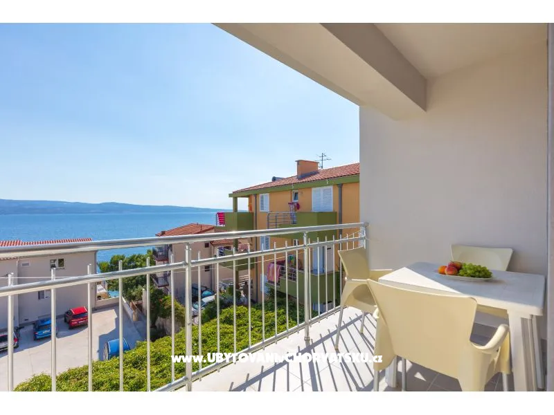 Studio S2+1 s čelním výhledem na moře - jednopokojový apartmán s manželským lůžkem a s možností rozkládací přistýlky pro dítě max do 12 let, vybavený kuchyňský koutek s chladničkou, koupelna se sprchou a WC, SAT/TV, klimatizace, balkón s posezením