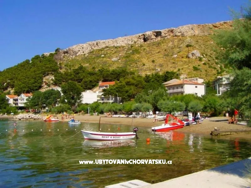 Apartmány v první řadě u moře a pláže. Dům je obklopen středomořskou florou. Některé apartmány mají klimatizaci a některé ne. V těsné blízkosti je betonová pláž (0m), písečná pláž (20m) a oblázková pláž (200m). V okruhu 2 km jsou k dispozici různé aktivity: - voleyball - běh po písečné pláži 4km dlouhé - surfing - škola potápění - rafting na řece Cetina - vodní lyžování - vodní polo - další vodní sporty - turistika - horolezectví - tenis - basketbal - malá kopaná - kola