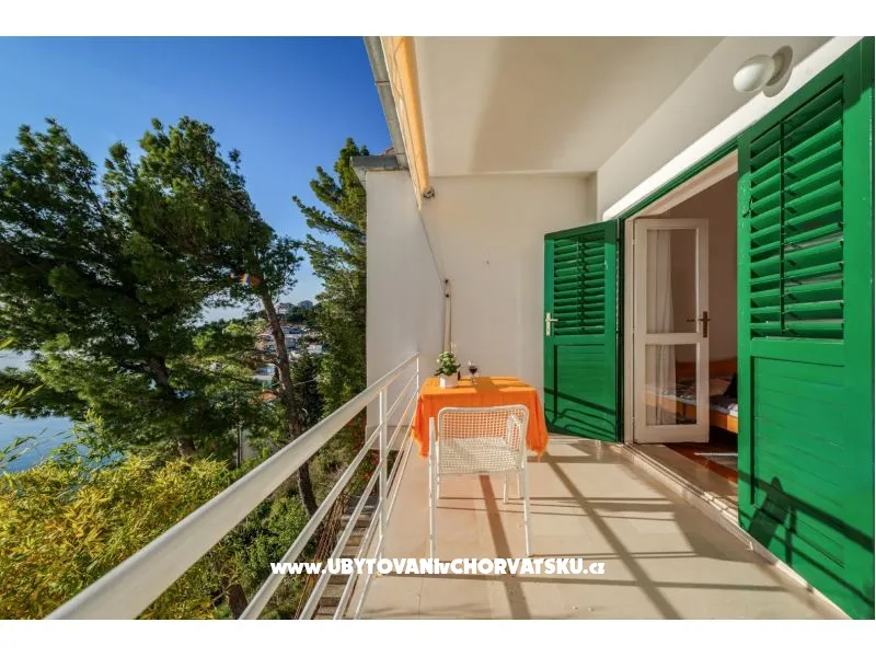 apartmán v 1. patře s klimatizací a s přímým výhledem na moře, ložnice s manželským lůžkem a lůžkem pro 3. osobu, oddělená kuchyňka s chladničkou, koupelna s vanou a WC, balkón s posezením a nádherným výhledem na moře.