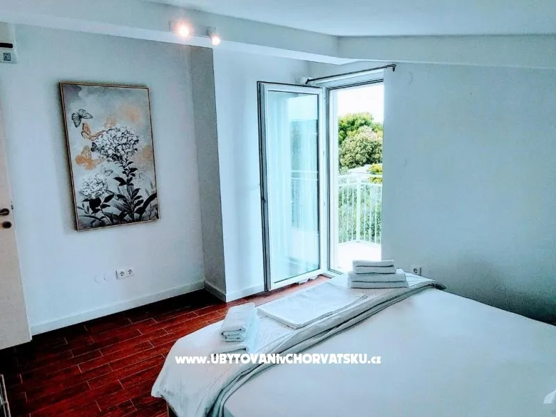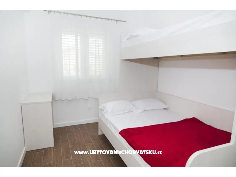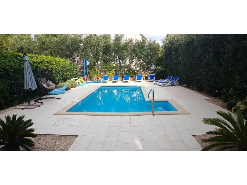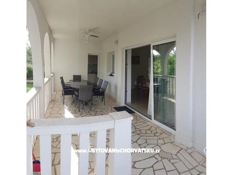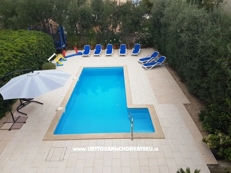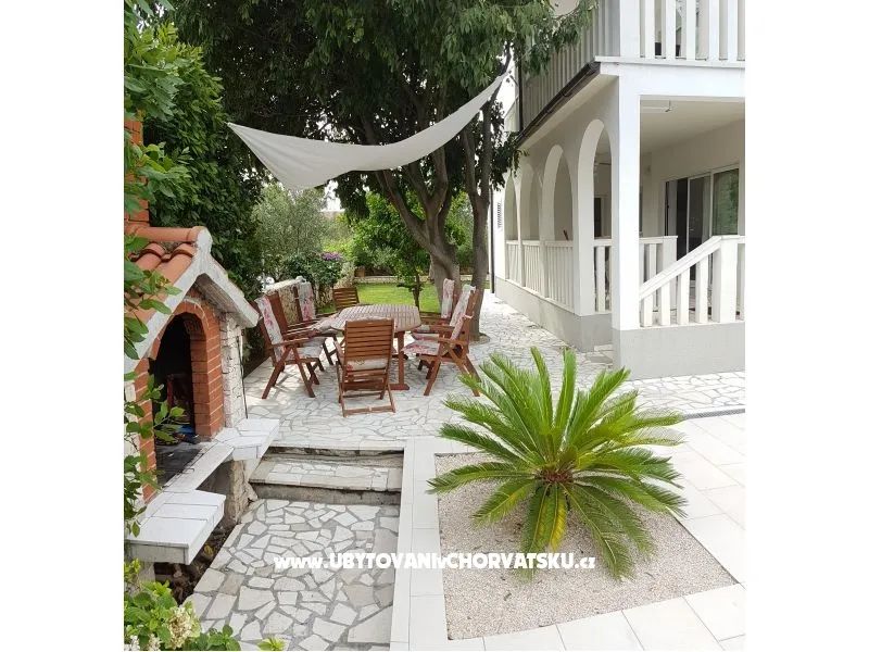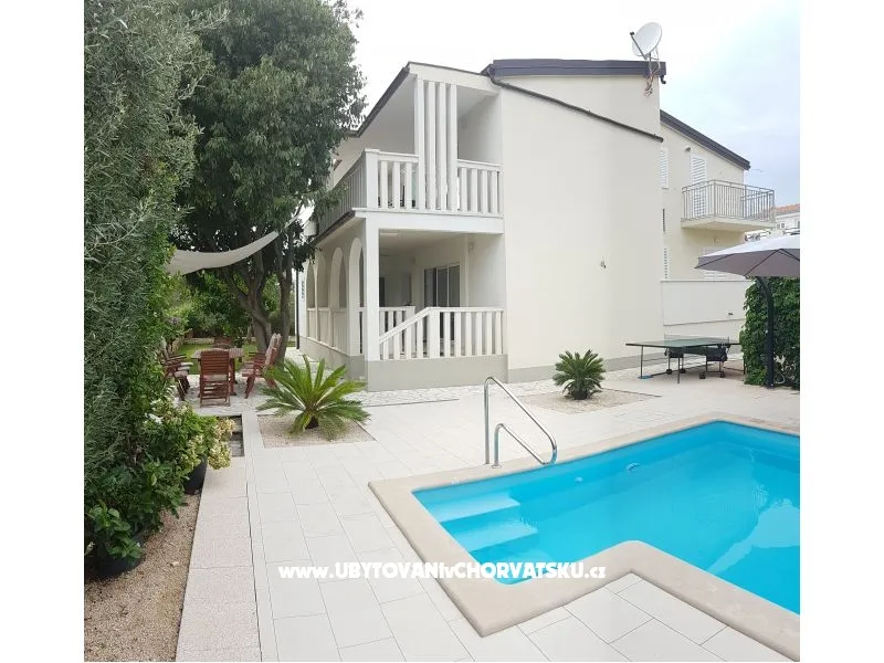 Dům se nachází na poloostrově, od Trogir 25 km a Primošten, 23 km, Split 48 km Dům má dvě podlaží. Přízemí: kuchyň, obývací pokoj, koupelna, dvě ložnice s koupelnou a manželskou postelí, pokoj s palandou, 2 klimatizační jednotky (jeden v obývacím pokoji, jeden na chodbě - pokoje) velká terasa 30m2, Z terasy vedou do zahrady a na bazén. V zahradní stůl pro 10 osob. Patro: kuchyň, obývací pokoj, dvě koupelny, dvě ložnice a manželskou postelí, pokoj s palandou, 4 klimatizační jednotky (jeden v obývacím pokoji, 3 - pokoje) velká terasa 30m2, Na zahradě je pokryta (stínové) parkoviště pro 5 automobilů. Na pláž je 100-120m východ a západ (poloostrov)